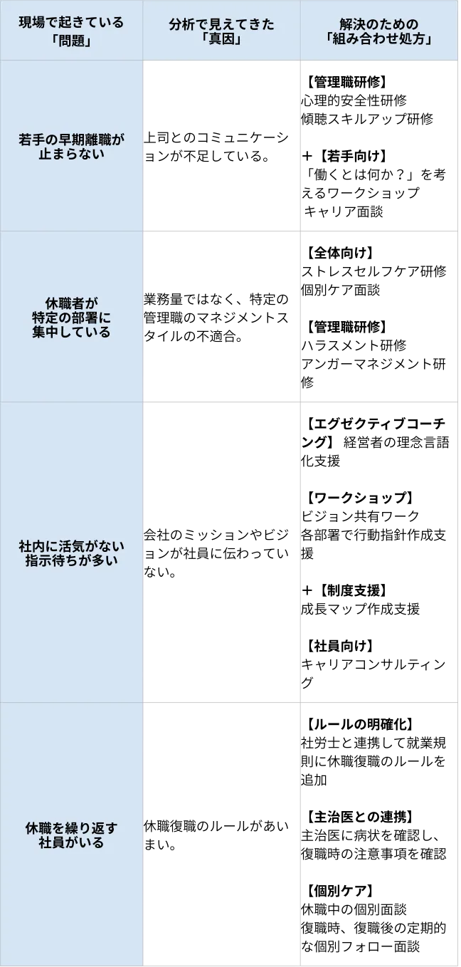 - ・課題の特定:表面化しているトラブル(離職や不調)の背後にある「真因(コミュニケーション不足、評価制度への不満、業務過多など)」を特定します。